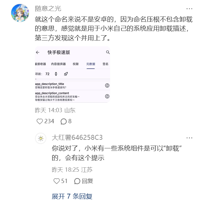 有网友对此进行了分析:“小米自己的接口,被抖音拿来放挽留文案了,这个原本是用来放系统应用卸载后果的,比如卸载手机管家的时候提示卸载后无法杀毒,卸载相册的时候提示无法查看照片之类的。”